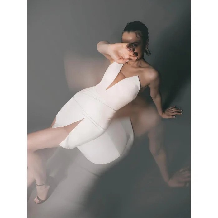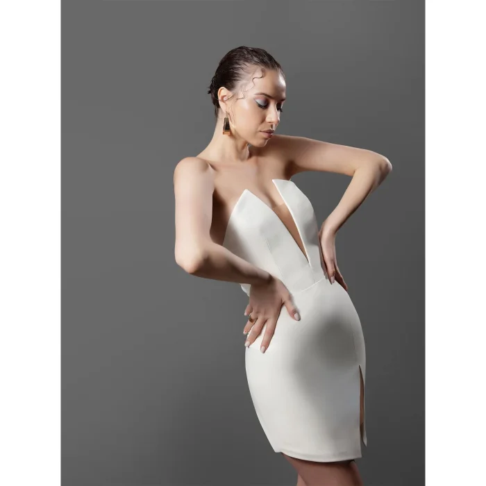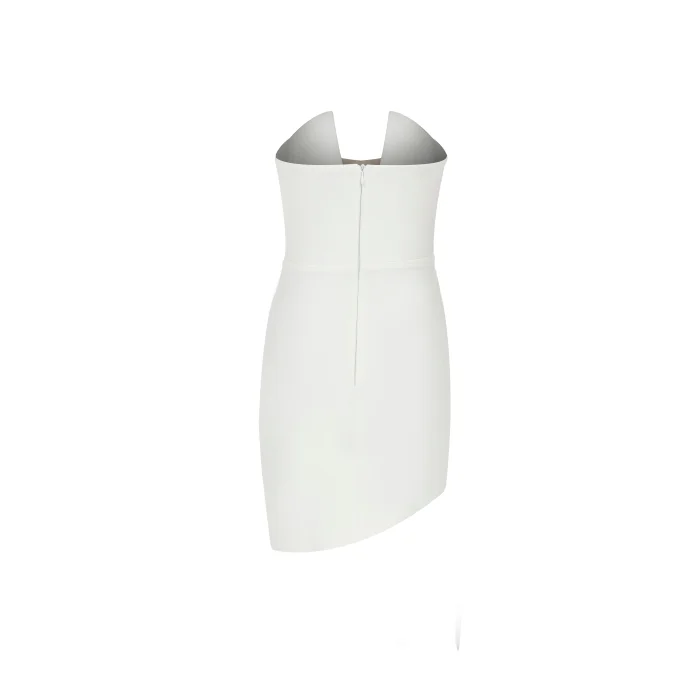 Asymmetrite white mini strapless dress with tulle.