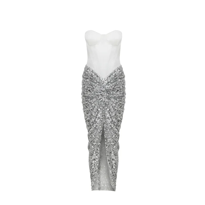 Silver sequin-sequin strapless dress.