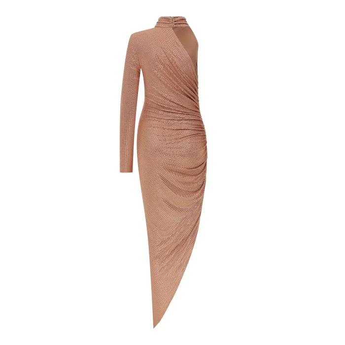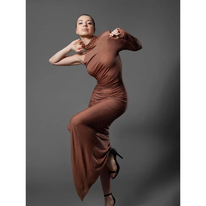Bronze-brown one-shoulder dress with a slit embellished with small bronze sparkling stones.