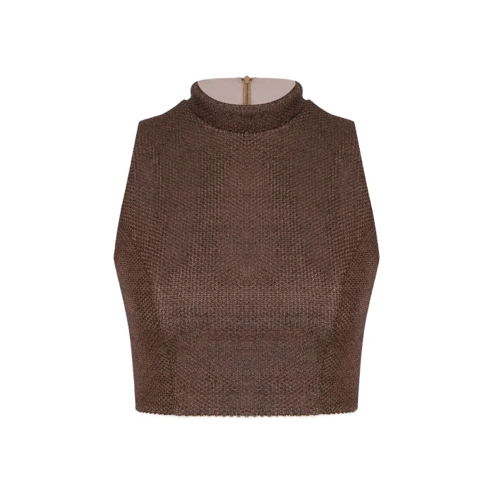 Sleeveless padded brown mesh skirt-top with brown half-cut glove detail.