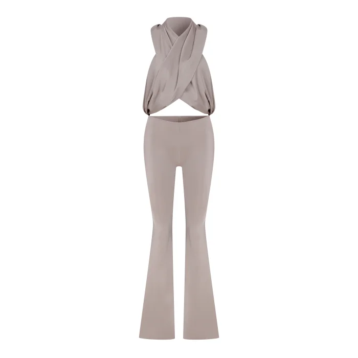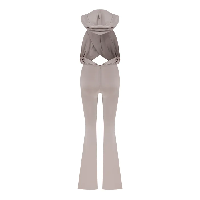 Shiny mink cross-neck jumpsuit with a hood.