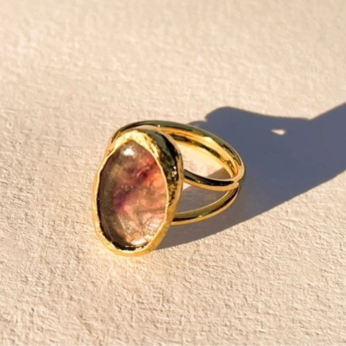 Amethyst stone is used. It is gold-plated on bronze. It is an adjustable size.