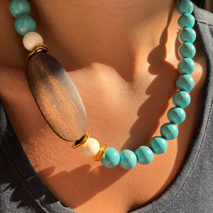 Turquoise stone, mussel shell beads and natural wood beads are combined together.