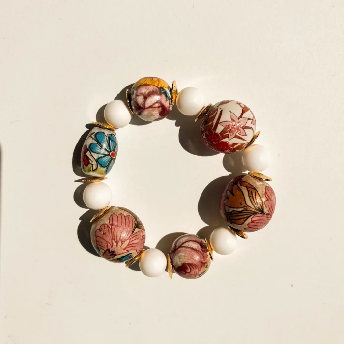 Hand-shaped and painted ceramic beads were used.