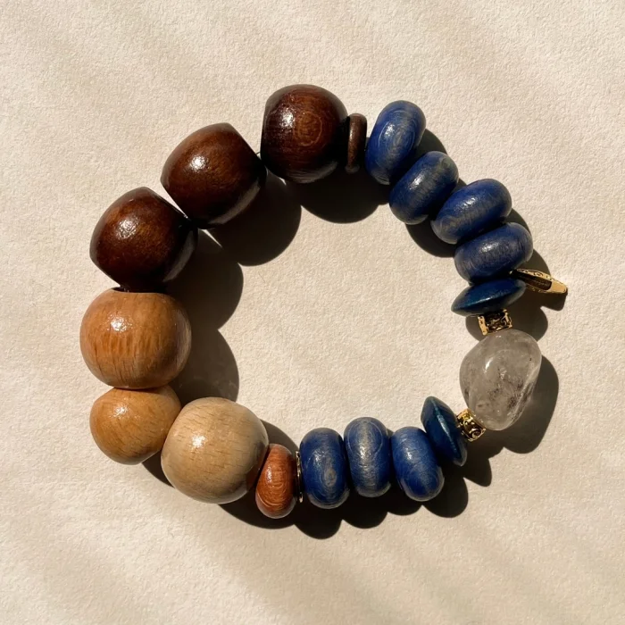 Natural wood beads and natural stones are used.