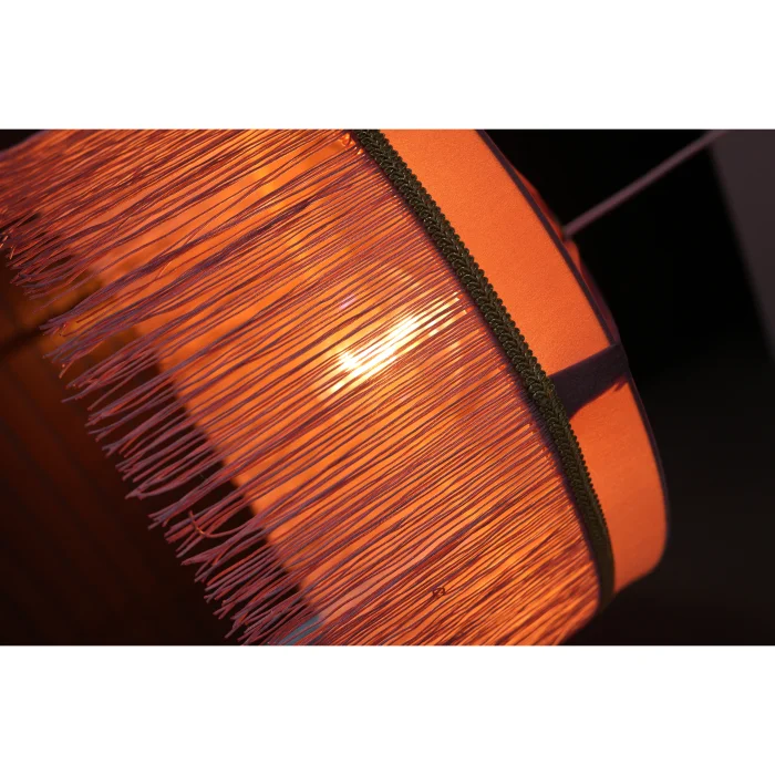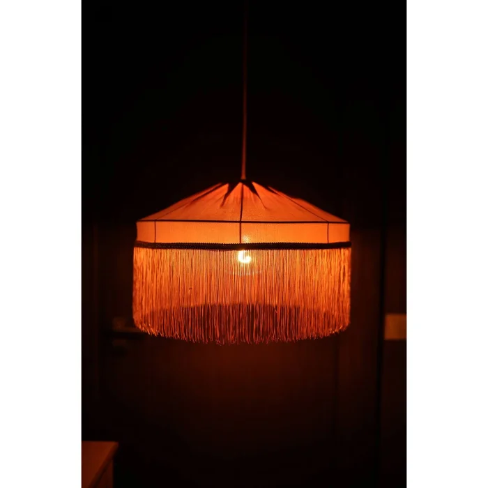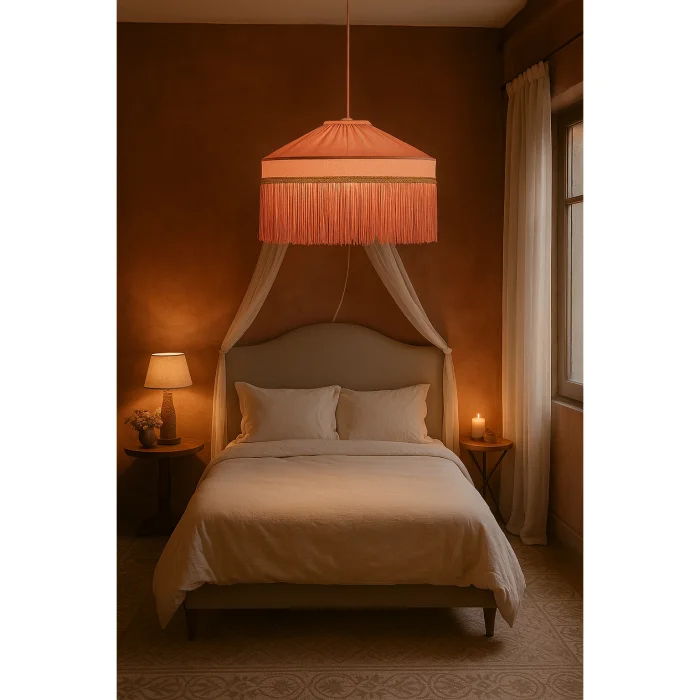 It creates a romantic ambiance with its soft coral tones and elegant tassels.