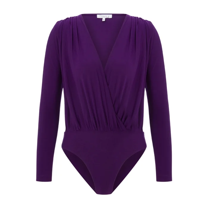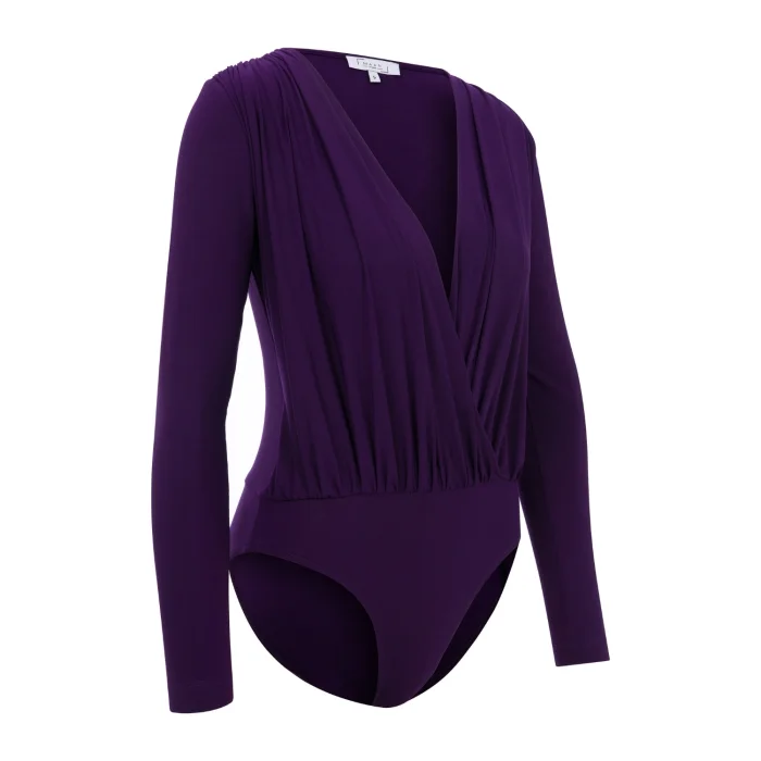 The bodysuit with a deep V-neck, long sleeves and snap buttons