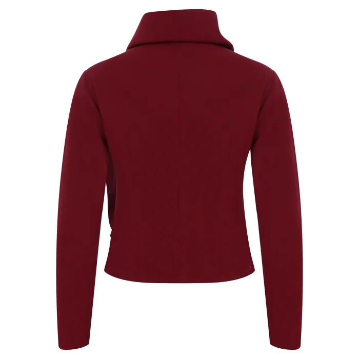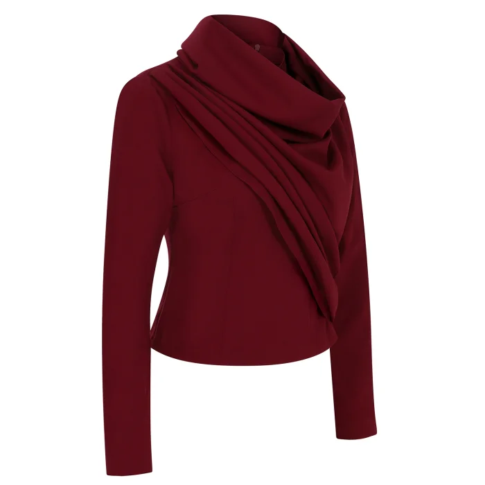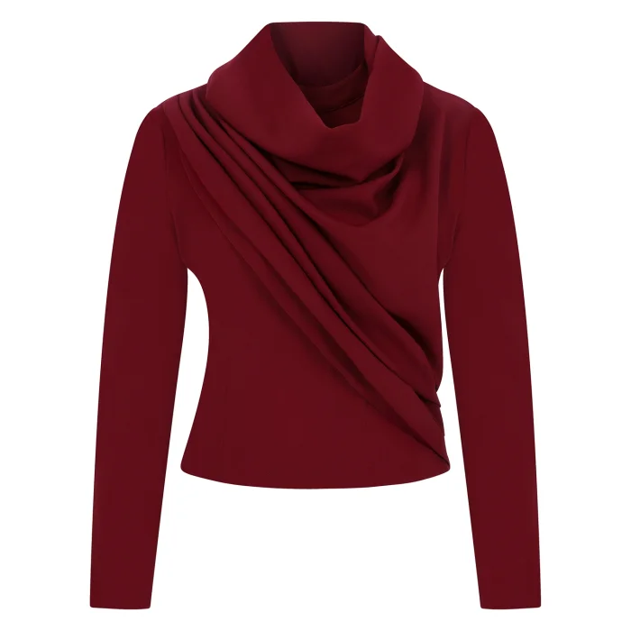 Elevate your wardrobe with this striking burgundy long sleeve top, designed for the modern woman who values elegance with an edge. This statement piece features a beautifully structured cowl neck with intricate draping that flows asymmetrically across the bodice, creating a sculptural silhouette that flatters and defines.