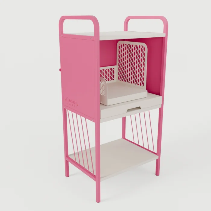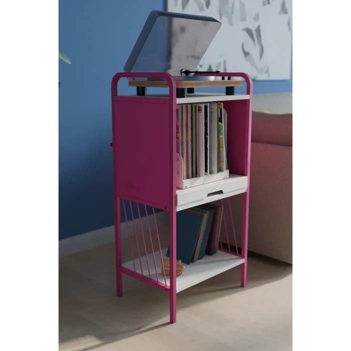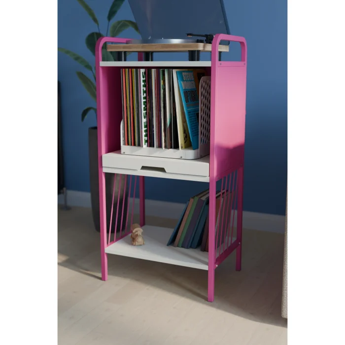 The top section features a generously sized platform ideal for turntable placement. Thanks to the sliding rail mechanism in the middle compartment, accessing your records is effortless and smooth. The lower shelf provides additional storage space for magazines, books, or accessories.