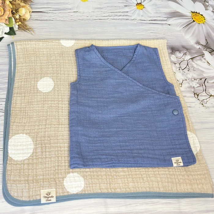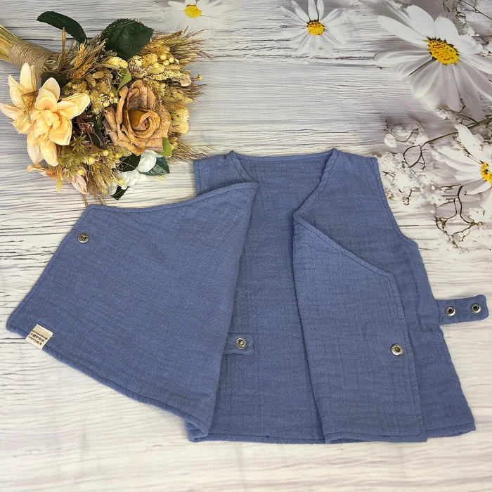 We are happy to bring you the baby vest that we produce from a total of 4 layers of muesli, 2 layers inside and outside. Our muslin vest is an indispensable product for the winter and spring months, which will wrap your babies in the softness of a cloud with its soft fabric and adjustable snap fastener both inside and outside, and will never squeeze them with its breathable structure. It is an ideal product that can be easily dressed after bathing and when waking up from sleep. It increases the comfort of your baby. With its structure that becomes soft as you wash, the muslin vest is suitable for frequent washing in the newborn period. Only cotton is used in our product, including our label. Designed in Turkey, made in Turkey. Length: 30 cm Width: 25 cm