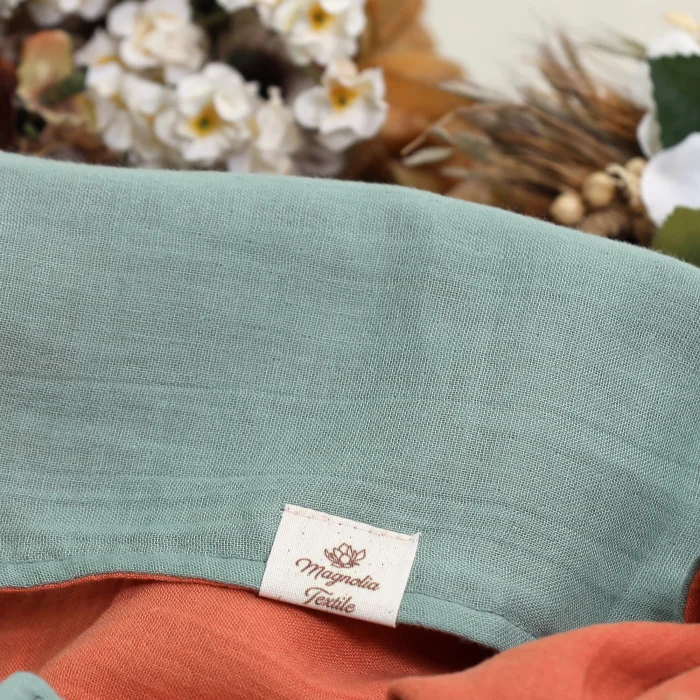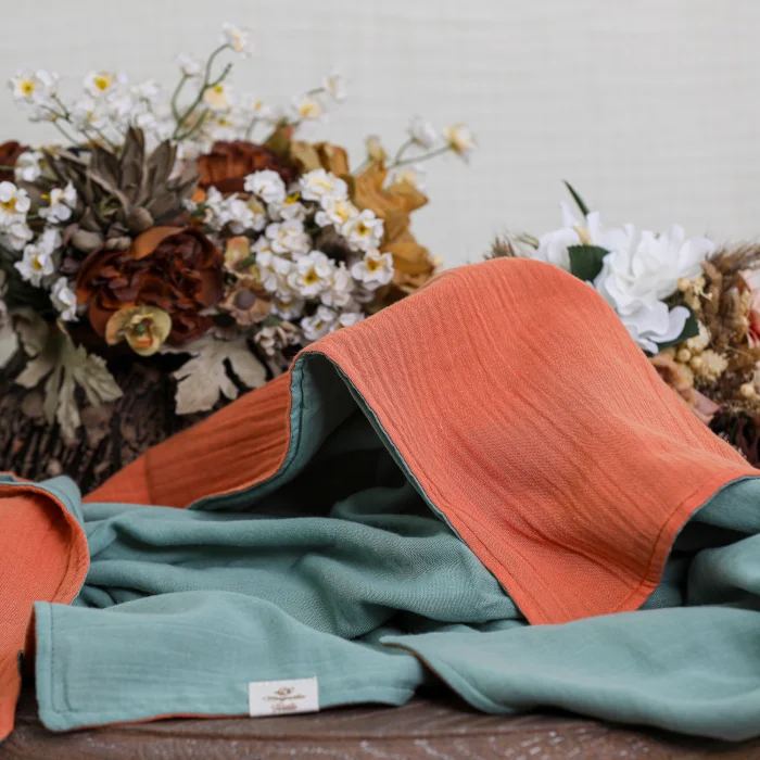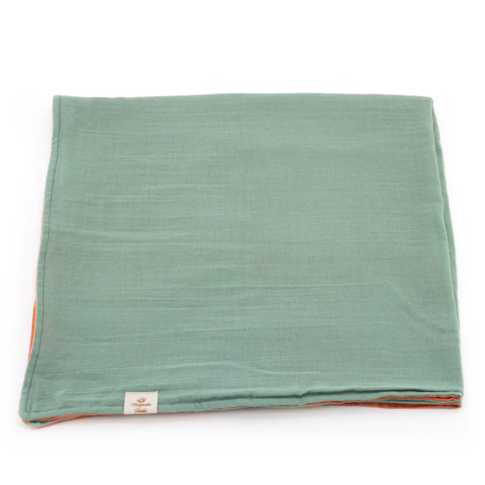 Our blanket is made of 100% cotton muslin fabric. It can be used on both sides, one side is green and the other side is orange.