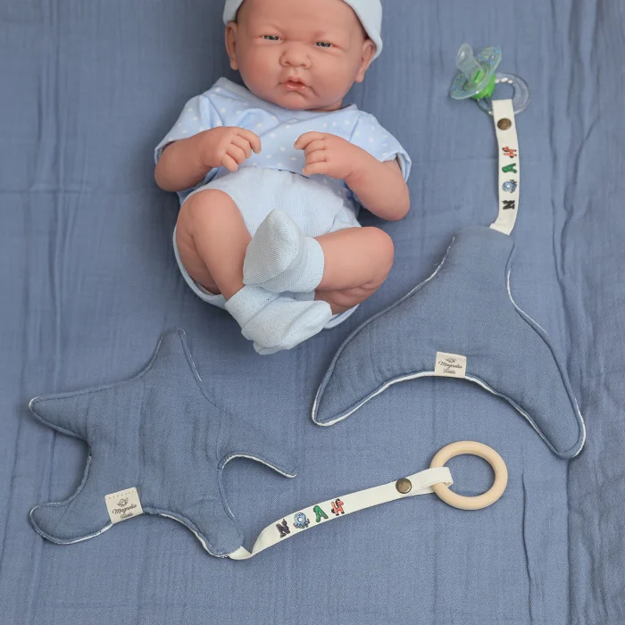 Made of soft, organic, handmade 2-ply muslin fabric, the teether/pacifier holder is shaped like a cute starfish.