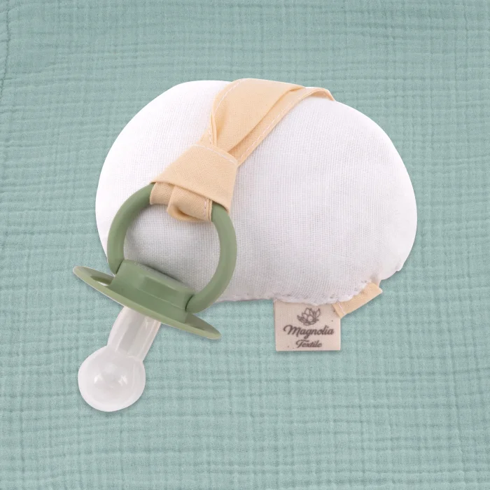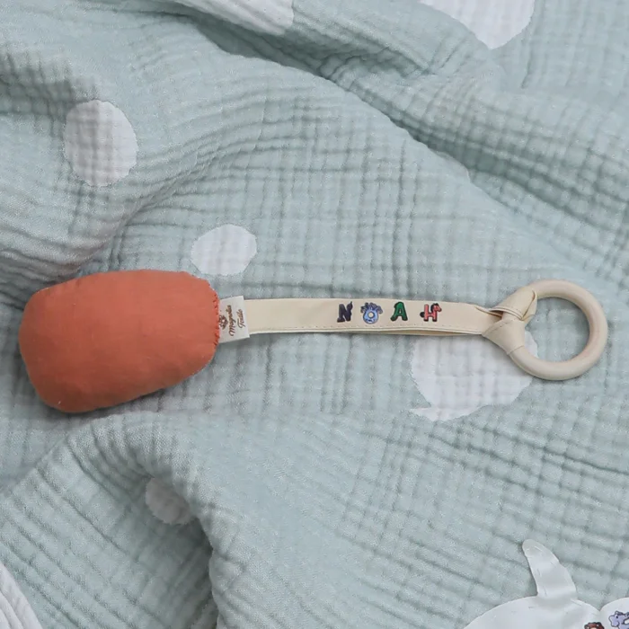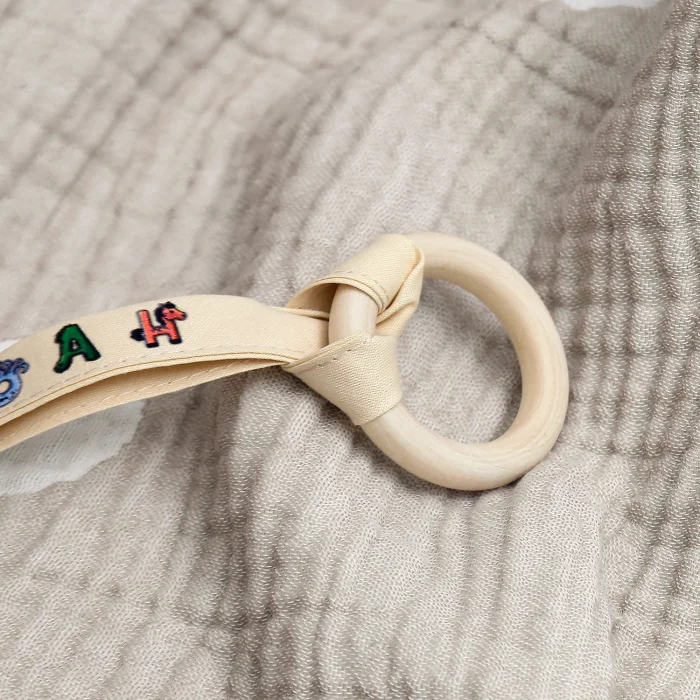 The teether/pacifier holder, which we produce from super soft, organic, handmade 2-ply muslin fabric, is in the shape of a cute egg. Your baby can hold the egg-shaped toothpiece with his hand, stimulating his senses and supporting the development of his motor skills. It can be a baby's first toy.