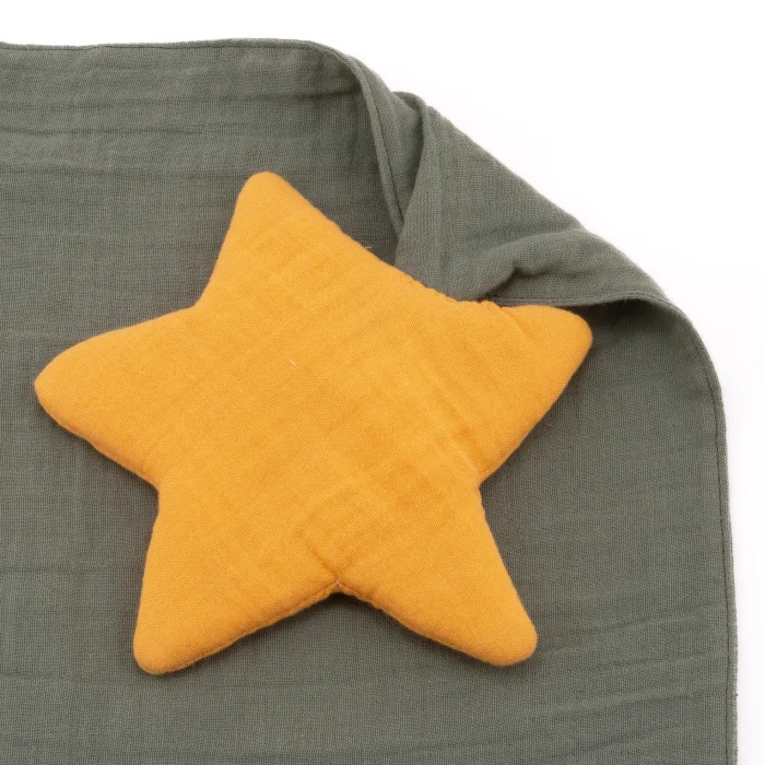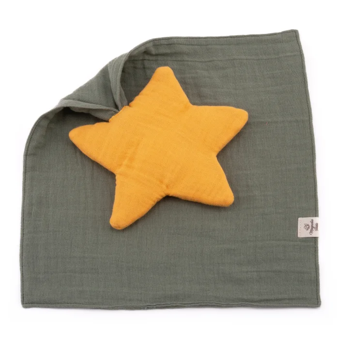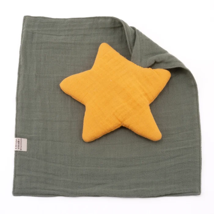 We lovingly present to you the handmade, star-shaped muslin sleep companion that we have specially designed for babies and children. With its colors and softness, it will increase your baby's comfort and facilitate the transition to  sleep... We have carefully prepared it from layered muslin fabric to make the star sleeping companion soft. We used high-quality fiber padding to make the sleeping companion look plump. You can find other products that may be compatible with the product at https://www.hipicon.com/magnolia-textile. We carry space to your baby's room with the star sleep companion... This product is designed to provide your baby with a feeling of comfort and security, making it their favorite toy. This is one of the softest and cutest sleep companions a baby can have. This is one of the important baby needs. What's the secret to the uniqueness of our favorite star sleeping companion? Muslin fabric is a type of fabric that is breathable and provides comfort to your baby. In this way, it provides the comfort of your baby and releases excess heat while giving heat when necessary. In addition, you will be surprised by its lightness. You can take this with you everywhere as it takes up little space. It is very comfortable and warm. This star-shaped sleeping companion is the perfect gift for expectant mothers and babies. This fabric is OEKO-TEX Standard 100 certified, which means it's gentle on your baby's skin and environmentally friendly (OEKO-TEX is a certification that makes sure textiles are free of harmful chemicals). Material: 100% organic cotton muslin fabric Dimensions: 25 x 25 cm