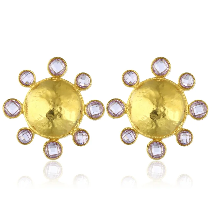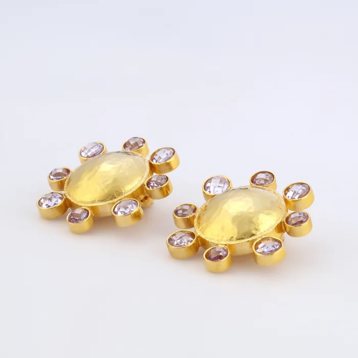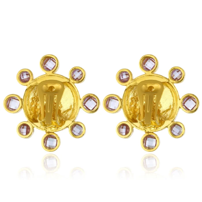 Handcrafted from 24-karat gold-plated silver-blended stainless brass set with Swarovski stones Free of nickel, lead and cadmium The earring clips are made of non-allergenic gold-plated 925 silver Earrings with clips Measures: Total Diameter: 3.5 cm Approximate weight per earring: 11 g
