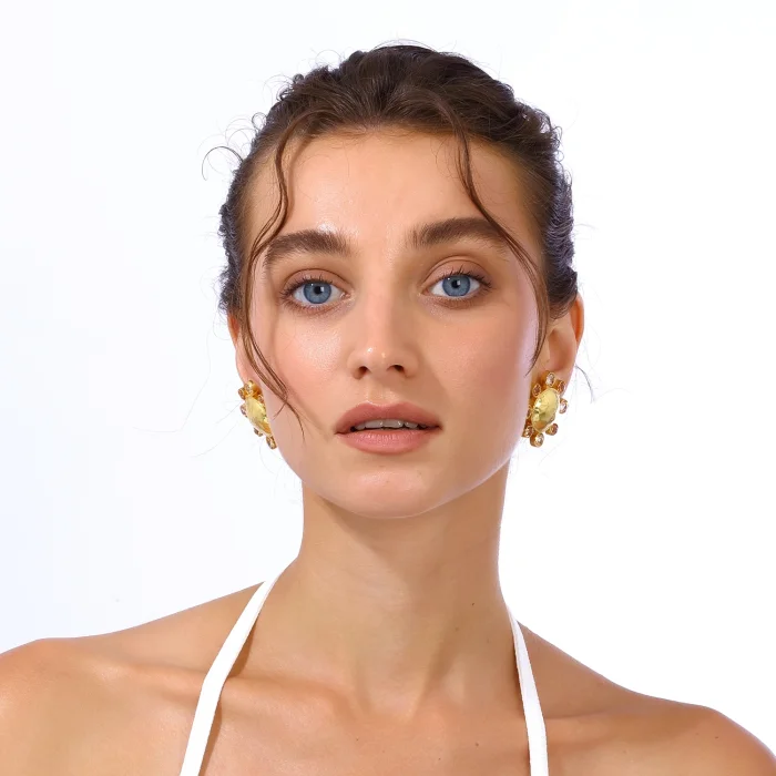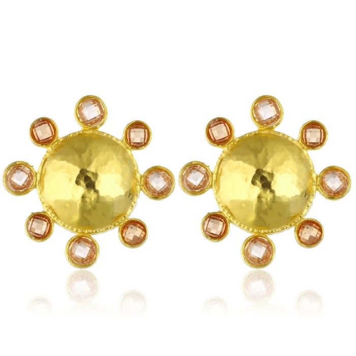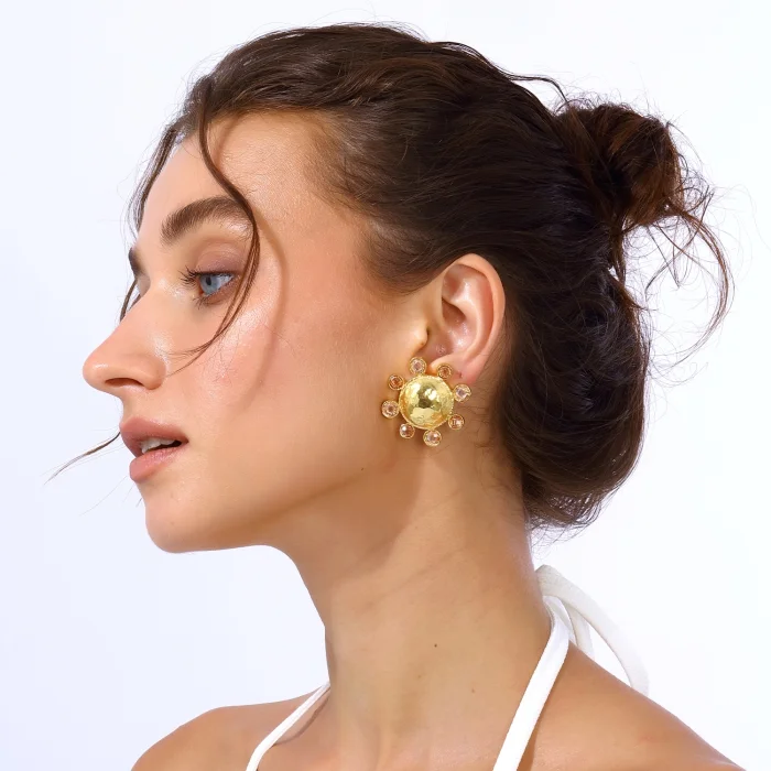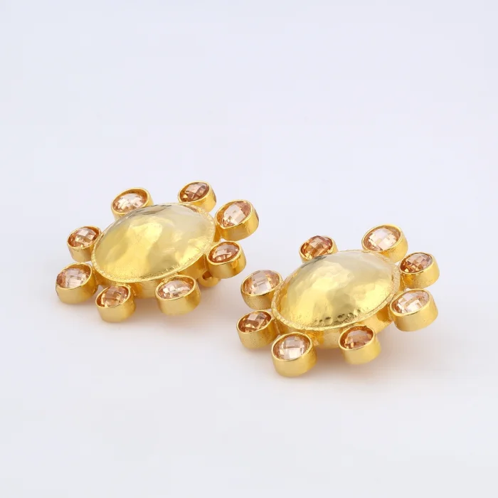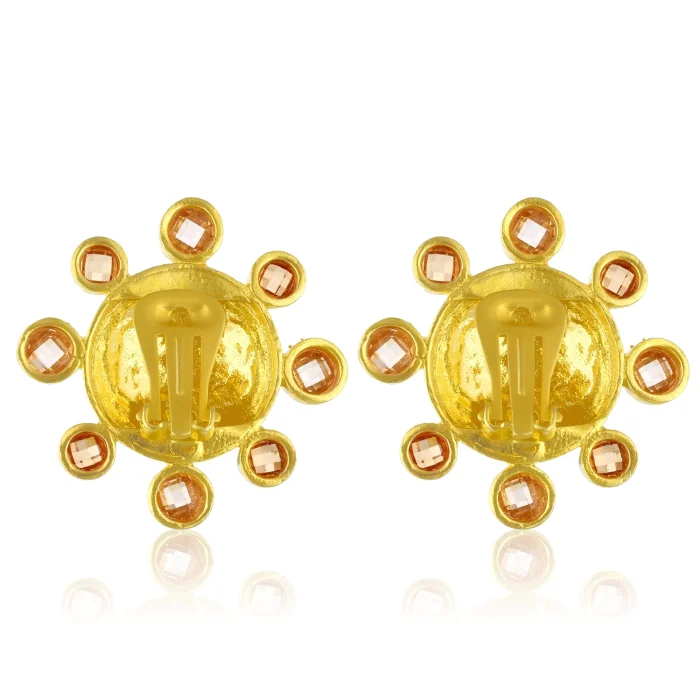 Handcrafted from 24-karat gold-plated silver-blended stainless brass set with Swarovski stones Free of nickel, lead and cadmium The earring clips are made of non-allergenic gold-plated 925 silver Earrings with clips Measures: Total Diameter: 3.5 cm Approximate weight per earring: 11 g