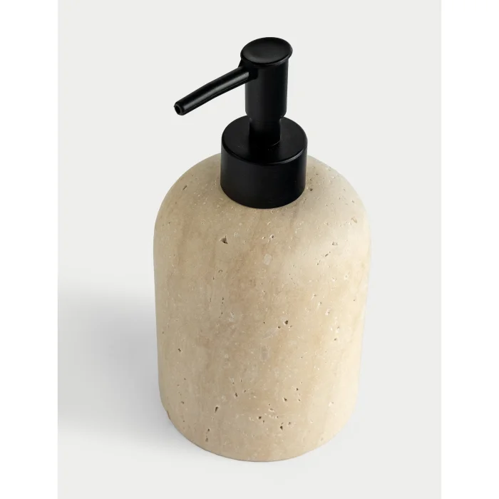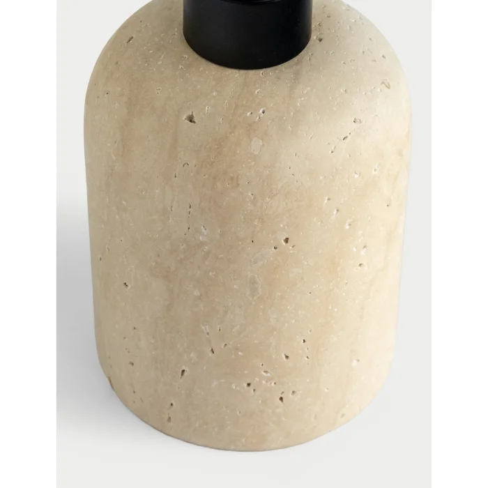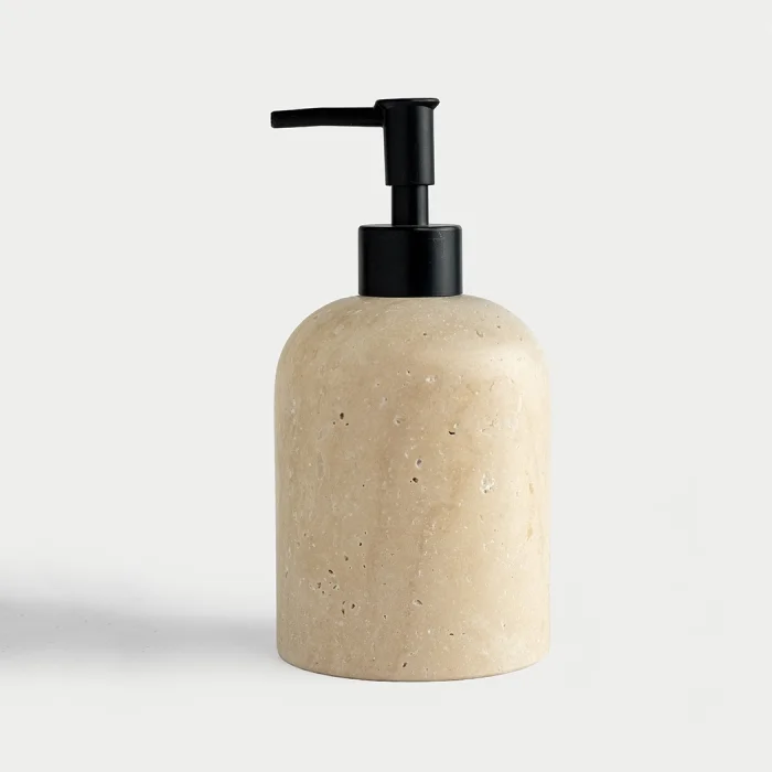 The minimal pores on the natural, light beige surface of travertine add warmth and organic texture to the bathroom ambiance. The cylindrical, soft-lined bottle form, combined with the weight and feel of natural stone, gives the product a lasting and timeless feel.