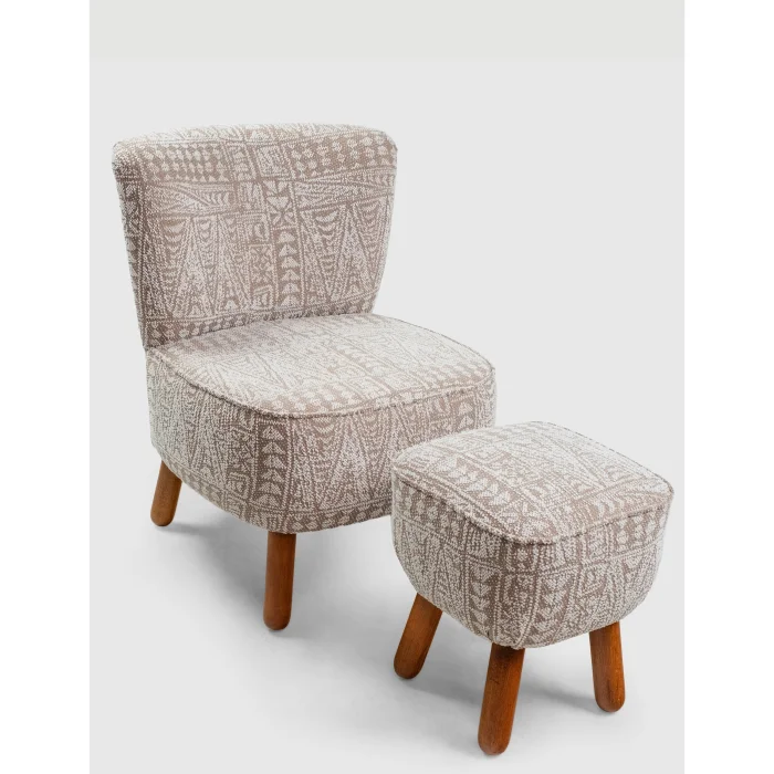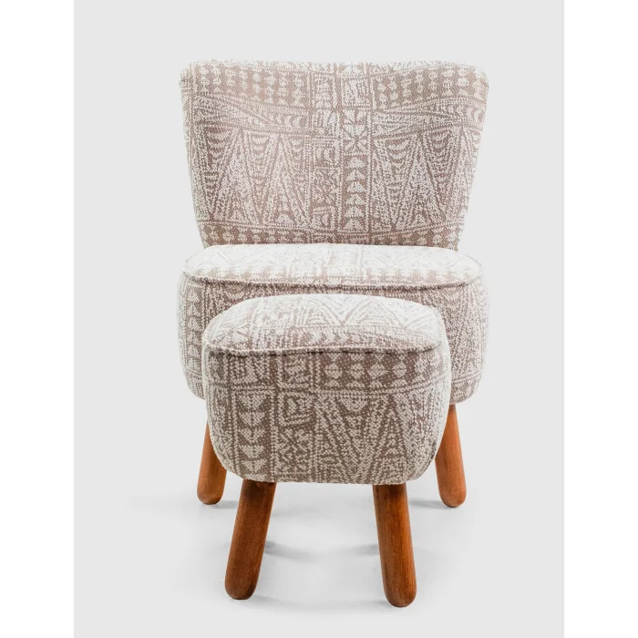 Mythology combines ethnic lines with traditional patterns of different cultures and natural materials to create a warm and sophisticated atmosphere in the home. The armchair and pouf duo becomes an accent point against the simple backdrop of the room.