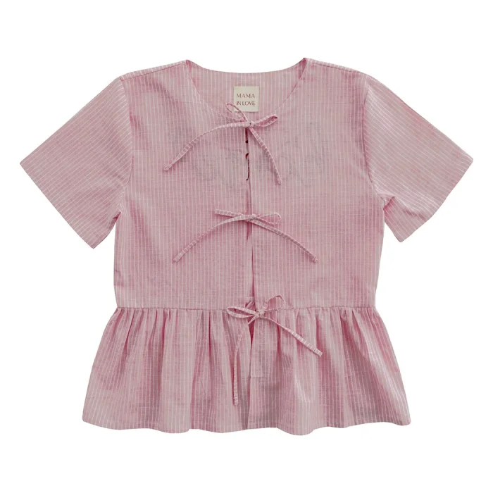 Cotton fabric. Pink and white striped fabric. Short-sleeved pajama top. Easy to wear with ties. Three bow details. 'let's stay home' embroidery detail on the back. It is sent in handmade cotton Mama in Love bags. Like all of our products, it is handmade.