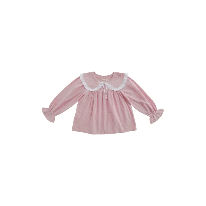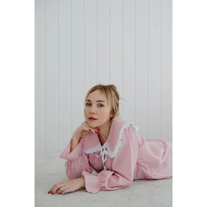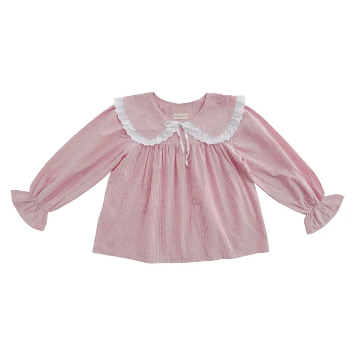 Cotton fabric. Pink and white striped fabric. Pajama top with long sleeves and elasticated sleeves. Pink baby neckline. White flick and bow detail on the collar ends. It is sent in handmade cotton Mama in Love bags. Like all of our products, it is handmade.