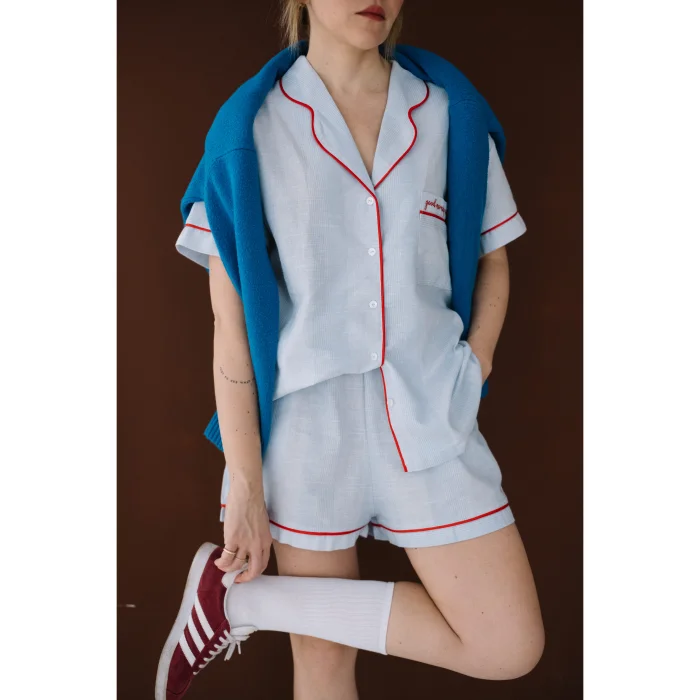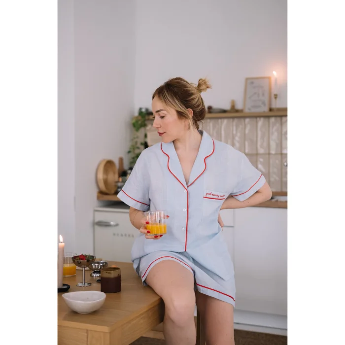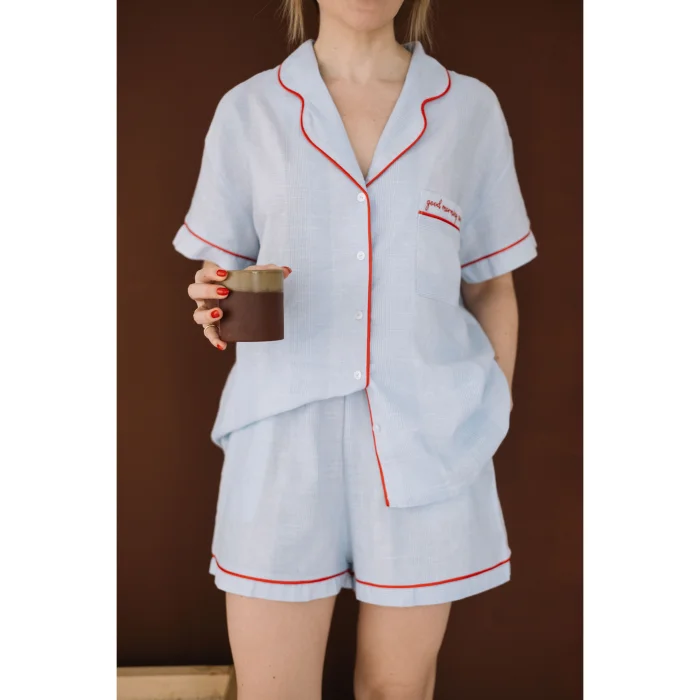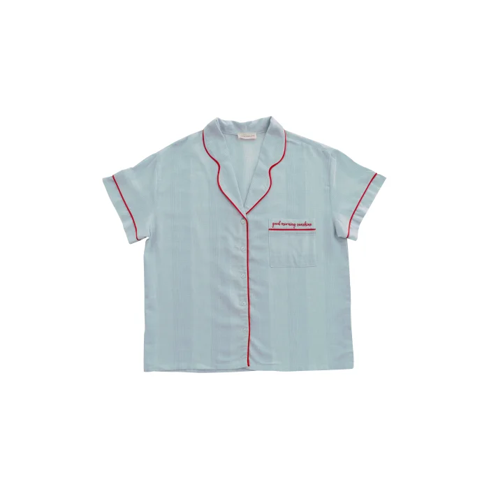 Cotton fabric. Light blue and white pinstripe fabric, short sleeve pajama top. Red piping detail on shirt collar. Applique pocket on left chest, 'good morning sunshine' embroidery and red piping detail. It is sent in handmade cotton Mama in Love bags. Like all of our products, it is handmade.