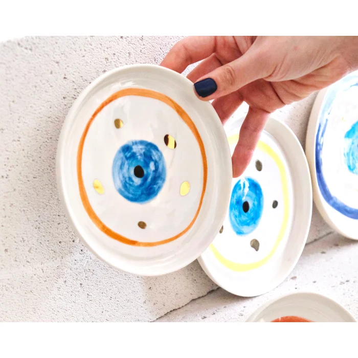 The handmade ceramic dessert plate has a shiny texture. It is decorated with colors of blue tones and has gold detail decors. The diameter length is 16 centimeters. It is a unique product because it is handmade and is specially produced for you after your order. For this reason, there may be slight differences with the product in the photo.