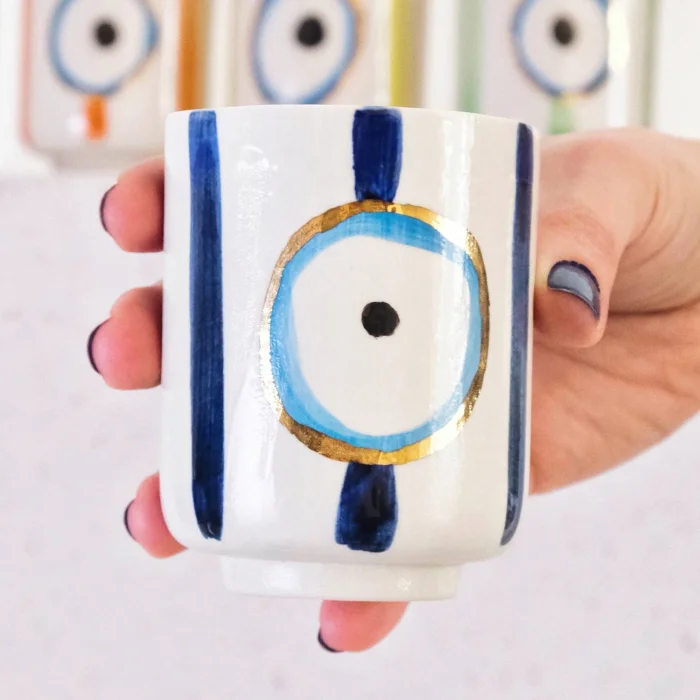 Product: Evil Eye Bead Patterned Gold Decorated Stoneware Coffee Cup