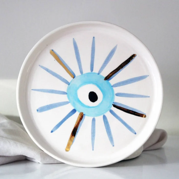 Product: Evil Eye Bead Patterned Gold Decorated Stoneware Dessert Plate