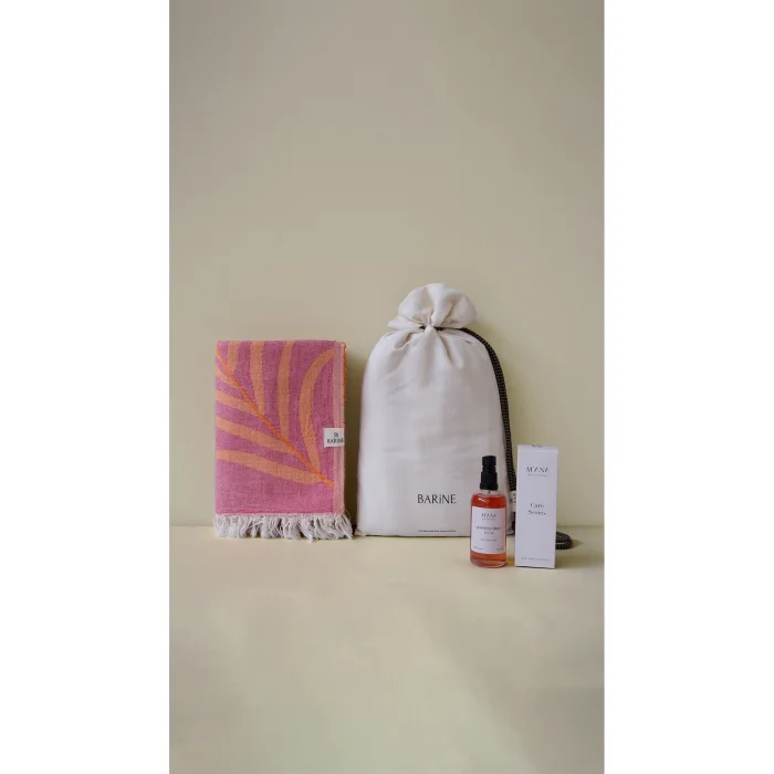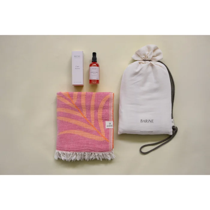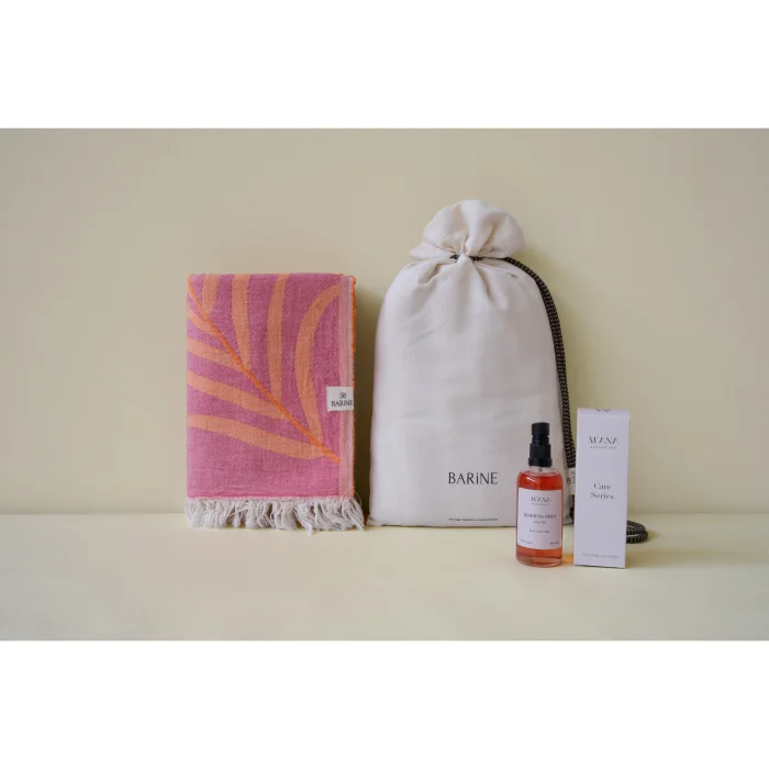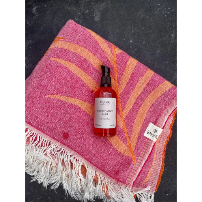 A combination of summer's elegant touch and natural care: The Moriah Peshtemal Gift Set offers a vibrant elegance with 100% cotton, double-layered muslin fabric and OEKO-TEX® certified Moriah Peshtemal's Orange-Fuschia tones, while the accompanying Goddess Vibes Dry Oil nourishes the skin without leaving an oily feeling on the skin with its coconut, sesame, St. John's wort oils and essential oils of lavender, geranium, ylang ylang and jasmine, moisturizes, soothes and repairs. It is a very effective after-sun care oil, especially thanks to its lavender and St. John's wort content. (Should not be used when going out in the sun) With its special loincloth bag, it offers both an aesthetic and practical gift option. Carrying the spirit of summer, this set is designed for those who care about style and naturalness.