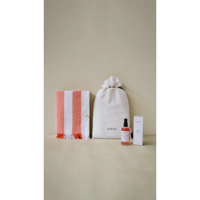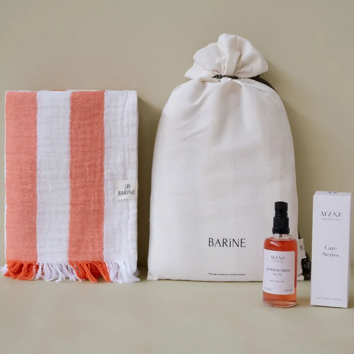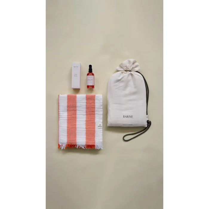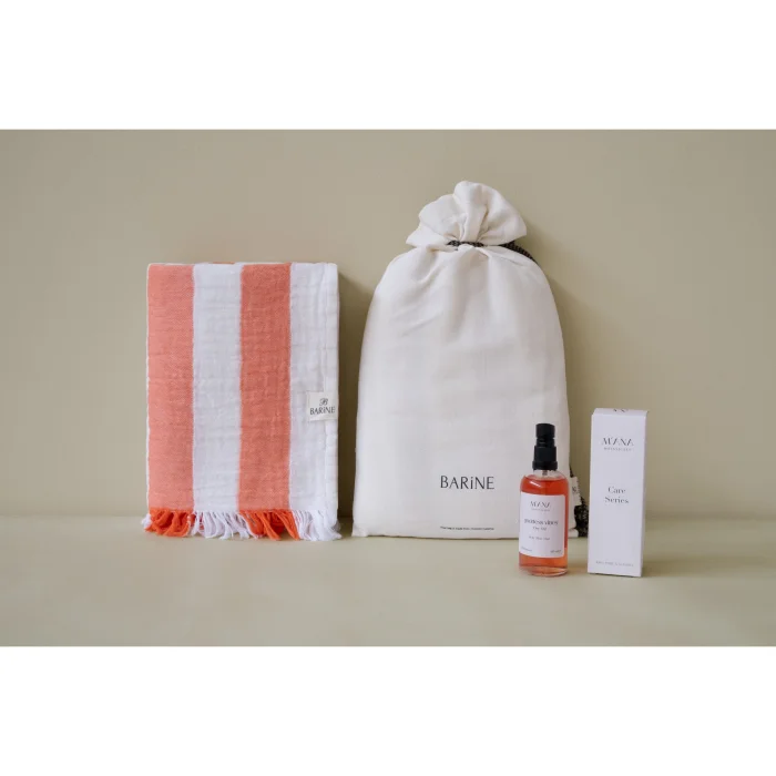 Offering the perfect harmony of natural elegance and skin care, the Striped Gauze Peshtemal Gift Set adds a modern touch to your summer style with its fine-lined texture. This lightweight loincloth made of 100% cotton, double-layered muslin fabric and OEKO-TEX® certified accompanies your every moment from the beach to daily use. Goddess Vibes All-Purpose Dry Oil, on the other hand, nourishes, moisturizes, soothes and repairs the skin without leaving an oily feeling on the skin with coconut, sesame, St. John's wort oils and essential oils of lavender, geranium, ylang ylang and jasmine. It is a very effective after-sun care oil, especially thanks to its lavender and St. John's wort content. (Should not be used when going out in the sun) With its special loincloth bag, it offers both an aesthetic and practical gift option. Carrying the spirit of summer, this set is designed for those who care about style and naturalness.
