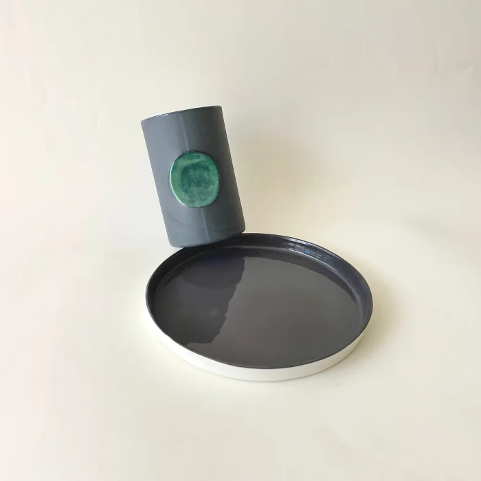 Produced using food-grade glazes. The inside is transparent glazed, the outer black part is silky matte. An external effect is given with a green glaze.