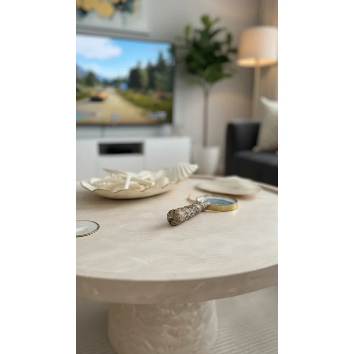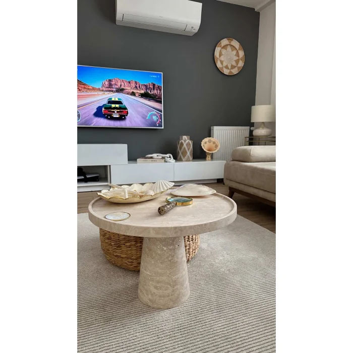 The product is handcrafted from real travertine.