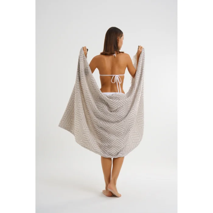 100% cotton, jacquard, 325 gr., 100x180 size, black & white, double sided, beach towel, loincloth. Produced in Denizli.