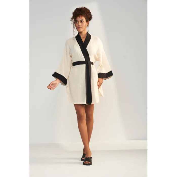 Comfortable cut, belted, 100% handcrafted stone print, 100% cotton, double layer muslin, made in Turkey. Shoulder 66cm., arm 30cm., height 85 cm.