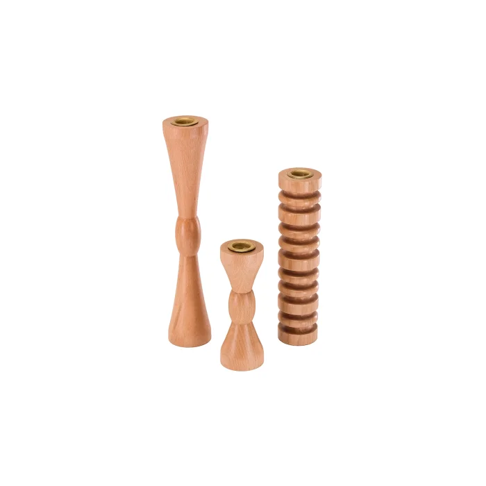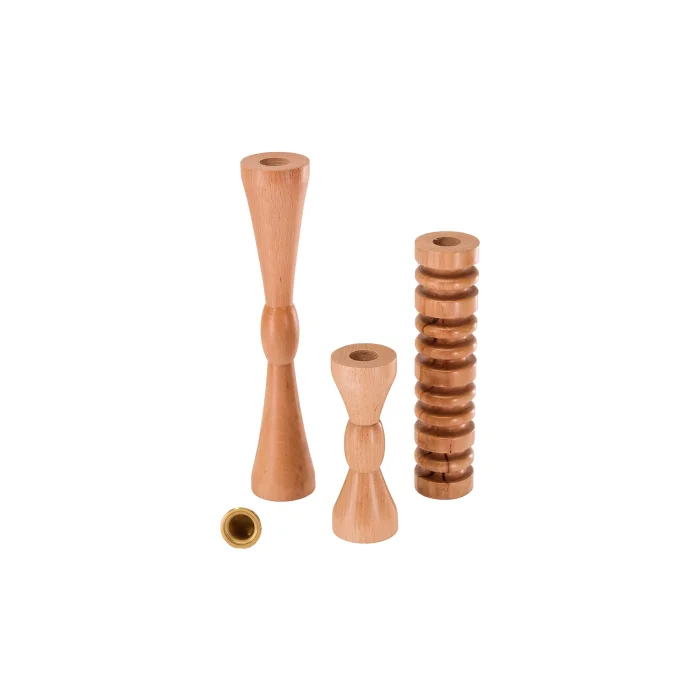 Bella 3-Piece Candlestick & Candle Holder is completely solid wood and is handcrafted from 1st class baked beech wood by applying traditional lathe techniques. There is a stainless candle apparatus made of brass material in the 21mm candlestick candle slot. This detail both facilitates product cleaning and adds a stylish atmosphere to the product. Natural Hardwax Furniture Oil 10 Gloss Special Matte in accordance with EN-71/3 standards was used in the polishing process. Measures; 1: 5.5cm, 5.5cm, 30cm 2: 5.5cm, 5.5cm, 23cm 3: 5.5cm, 5.5cm, 15cm Since our product is handcrafted, there may be millimetric differences in dimensions. There may be differences in tone and moiré between the product you will buy and the product in the image due to the natural structure of the tree.