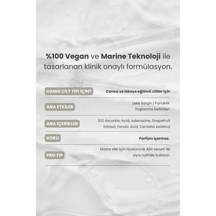 is a vitamin C serum that helps to brighten the skin, eliminate tone inequalities and minimize signs of aging with its natural Niacinamide content obtained from 10% Ascorbic Acid, Ferulic Acid and Blue Green Algae Spirulina.