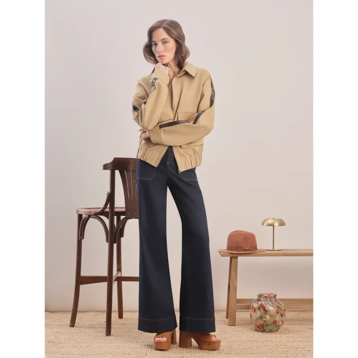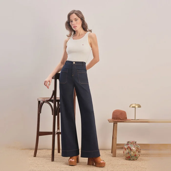 High waist, boot-cut design. Dark indigo wash and pronounced contrast seams throughout the seam. Red logo embroidery on the right front pocket. Body-fitting cut on the buttocks and upper leg. Wide leg. Standard mold.