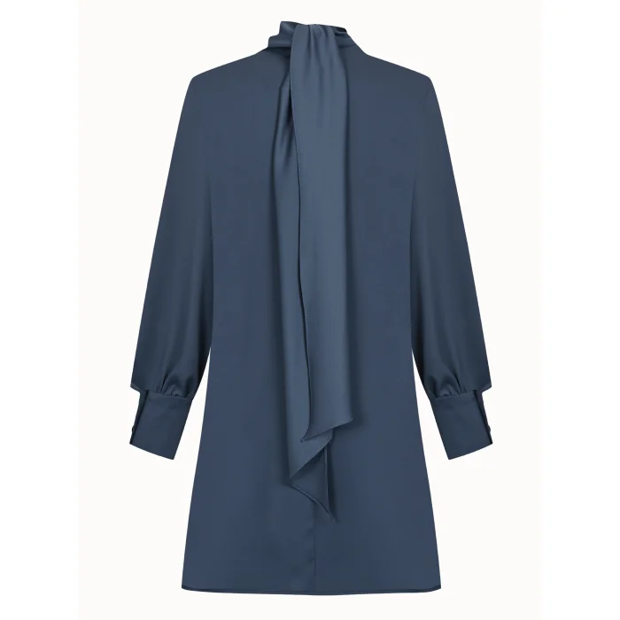 Designed from matte satin fabric, this mini dress features a drape detail on the front and an elegant high neckline, creating a sophisticated silhouette. It gains movement with its long sleeves with buttoned cuffs and elegant scarf detail at the back. Ideal for an elegant look ranging from evening invitations to special occasions.
