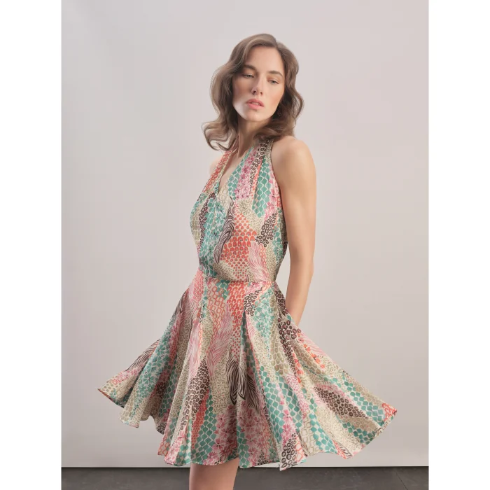 Mini satin dress with a halter neckline, flared skirt that sits at the waist. The back is low-cut. Zippered at the back. Standard mold.