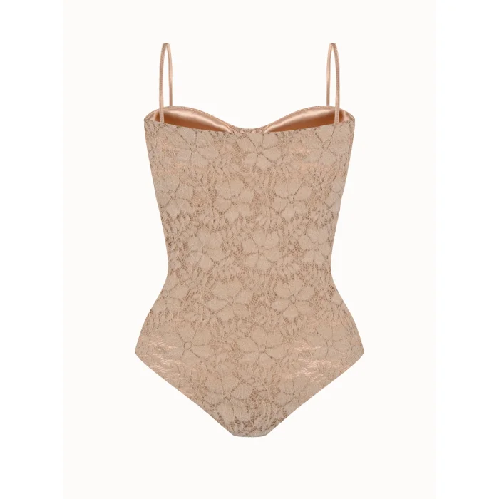 Designed with feathered lace, this corset-shaped bodysuit creates an elegant silhouette with its globe detail on the chest and transparent panel in the waist area. It offers comfort with its thin adjustable straps and snap crotch. Ideal for an elegant look that stretches from night to day.
