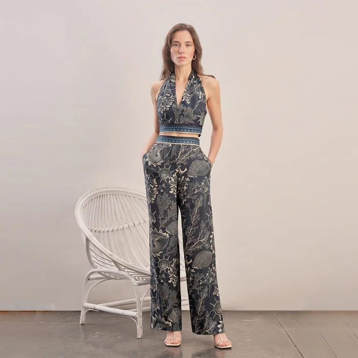 Loose-fitting trousers with side zippers. High waist, elasticated at the back. Pockets on the sides. Stripe with a contrasting pattern at the waist. Standard mold.