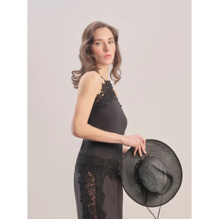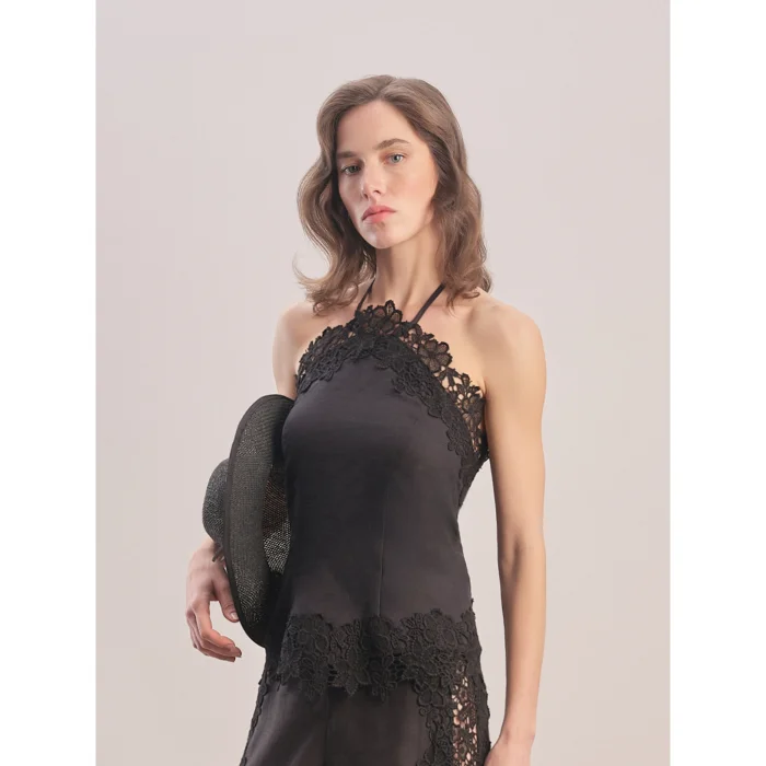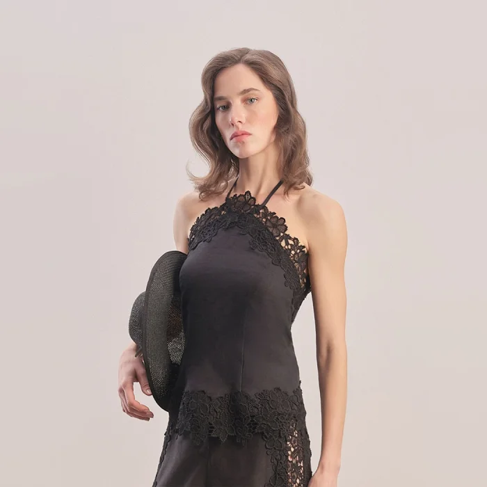 Linen top with neck tie, sleeveless. Embroidery details on the collar and hem. Open back, zippered at the waist. Standard mold.