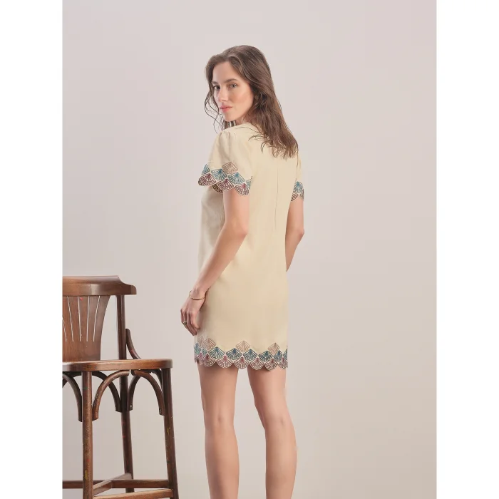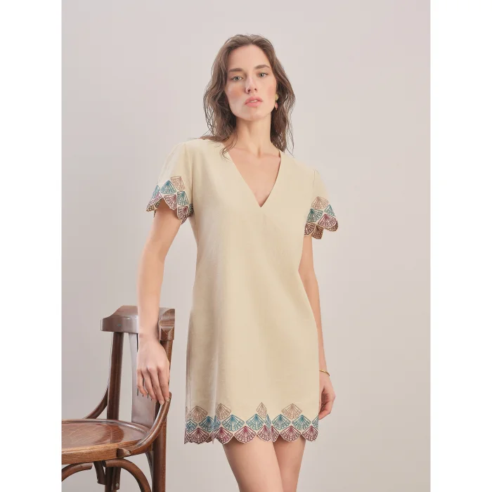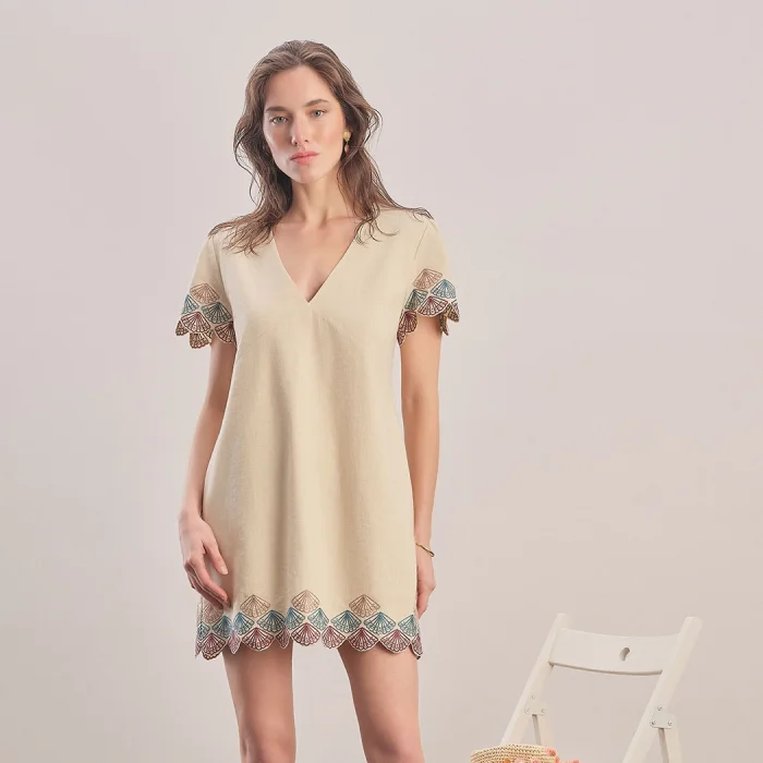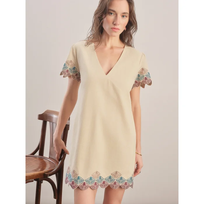 Linen - cotton blend, half sleeves, mini dress. Embroidery with an oyster pattern on the sleeve and hem. Zippered at the back. Standard mold.