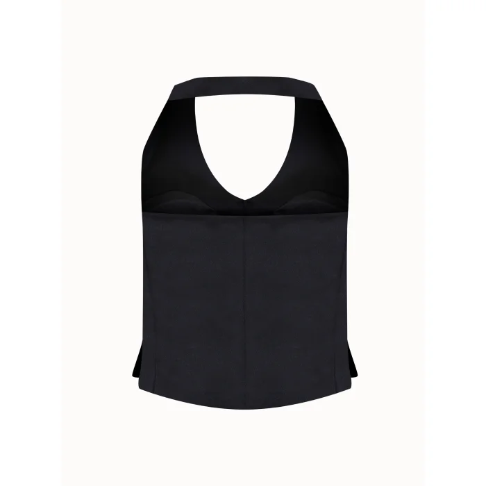 Sewn from smooth black satin, this halter vest has an elegant stance with its deep neckline, decorative buttons and flap pocket details. The open back design creates a modern and sophisticated silhouette. A signature piece for chic looks from day to night.