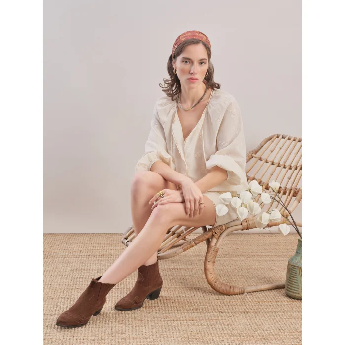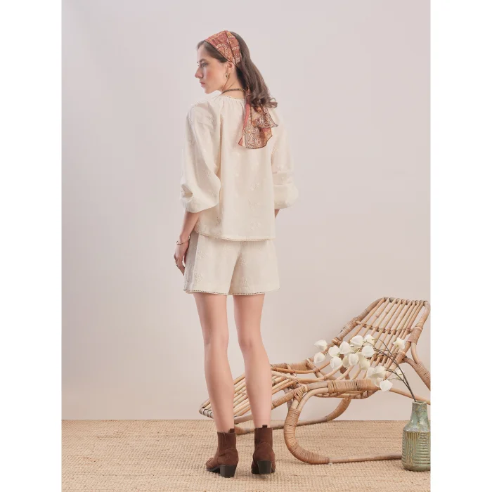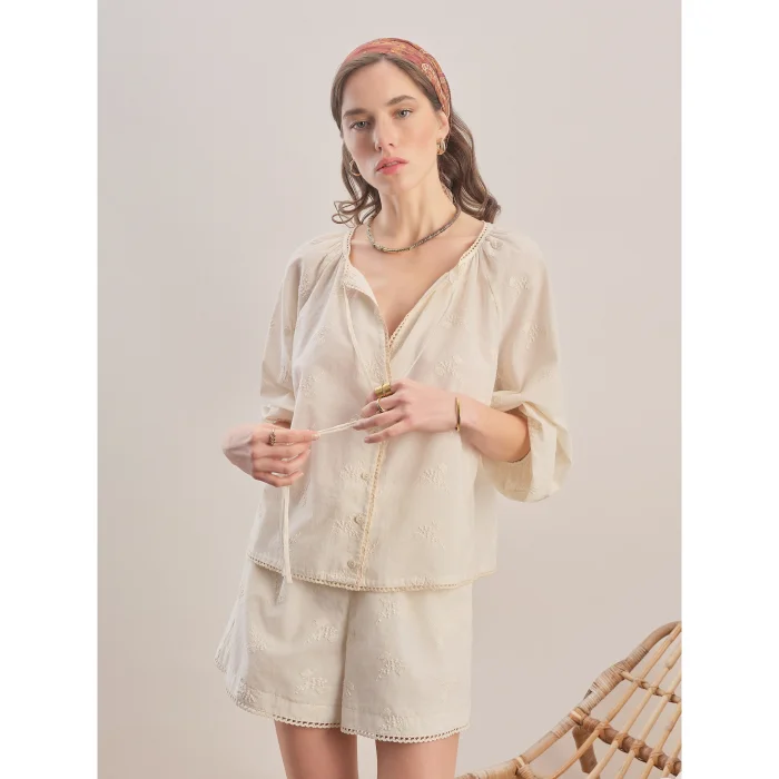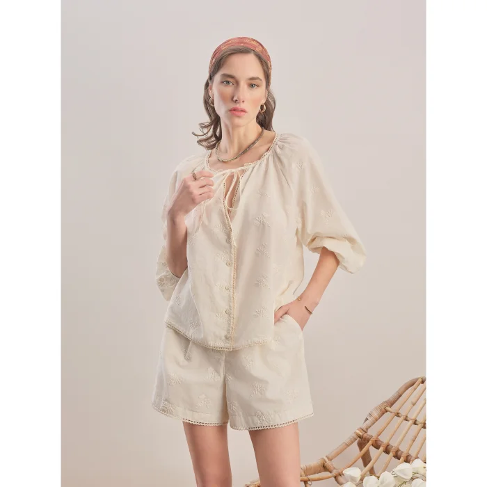 Bohemian style shirt with buttons at the front. Elaborately embroidered exquisite embroidery figures. Embroidered edge decorations on the collar and hem of the shirt. Wide collar with ruffles. Balloon sleeve. Standard mold.
