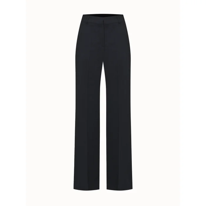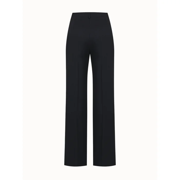 Designed from soft black crepe, these trousers offer a modern silhouette with a high waist cut and legs that flare gracefully from the knee. It gives it an elegant look with its front ironing lines.