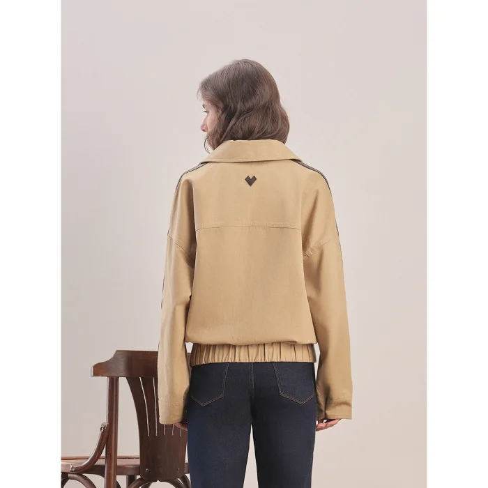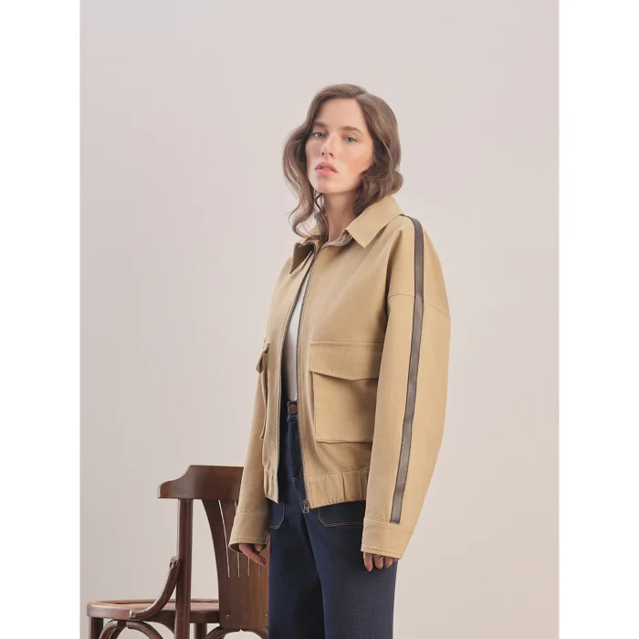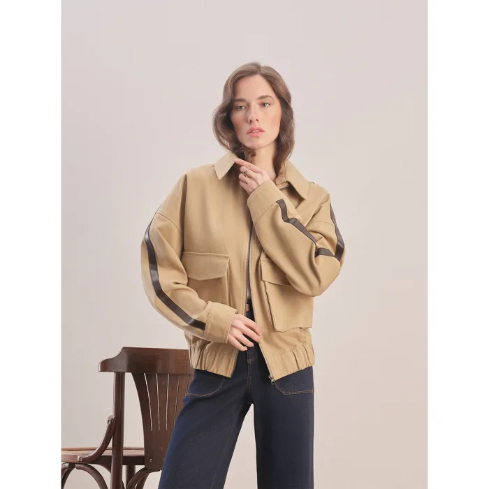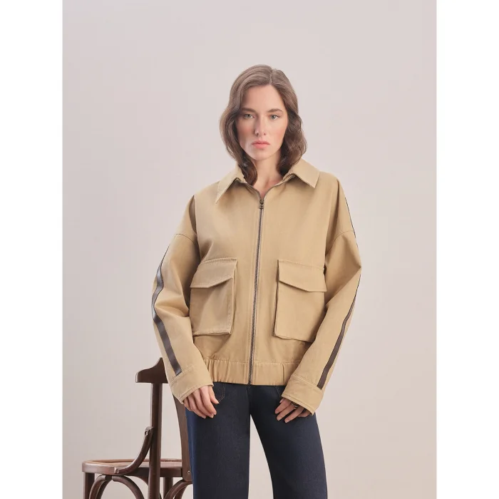 Oversized cut. Detachable shirt-style collar. Leather stripe detail on the sleeve. Adjustable cuffs with snap fasteners on the wrists. Side pockets. Front zipper and snap closure. Dropped shoulder. Elasticated hem. Logo on the back.