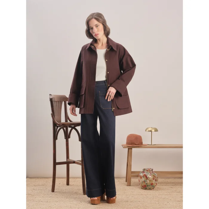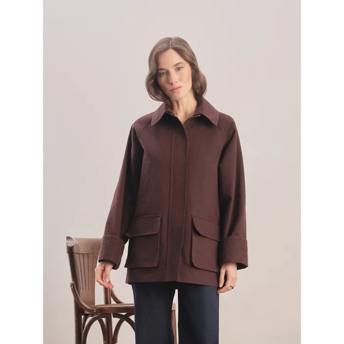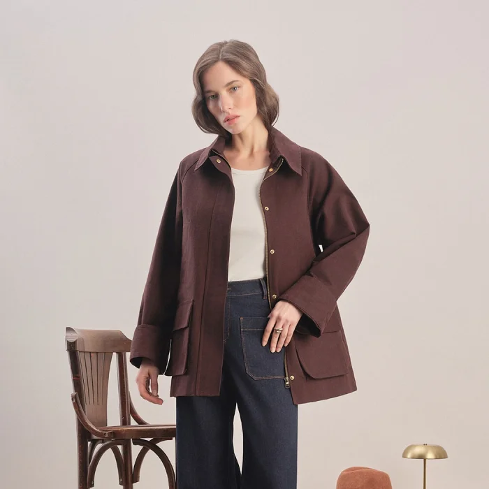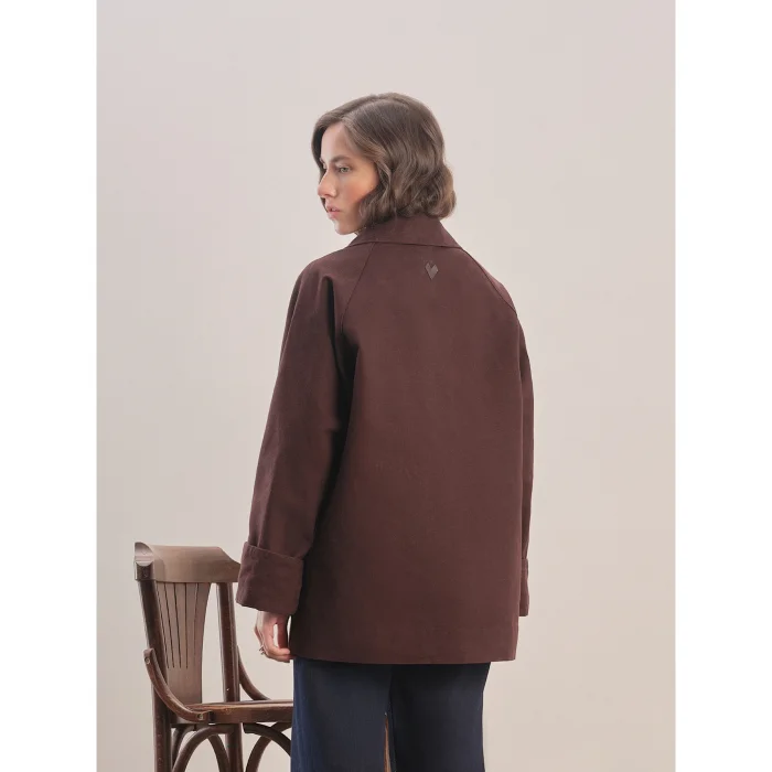 The fabric is coated with a lubrication process. Oversized cut. Detachable shirt-style collar. Straight arm. Side pockets. Front zipper and snap closure. Flat cuff. Dropped shoulder. Straight hem. Logo on the back.