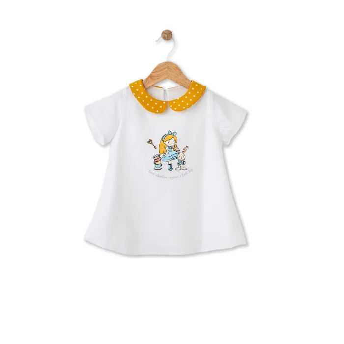 Dress with yellow polka dot collar detail, short sleeves, round neckline, drop-cut back buttons, Alice patterned lining