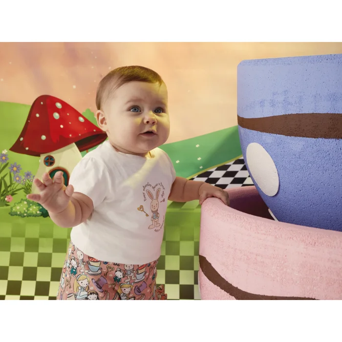 Two-piece set. Alice-patterned, round-necked, short-sleeved shirt with a snap closure at the shoulder.